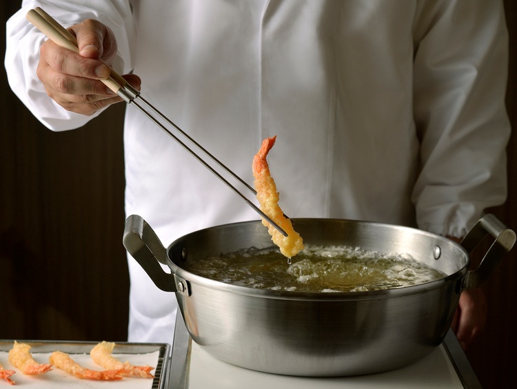 ディナー人気No.1のサーロインローストビーフや、椿油入りの油で揚げる天麩羅のほか、お一人様一皿のチケット制メニューとして「牡丹海老の握りと白海老磯海苔巻き」など、贅沢な逸品が並びます。
